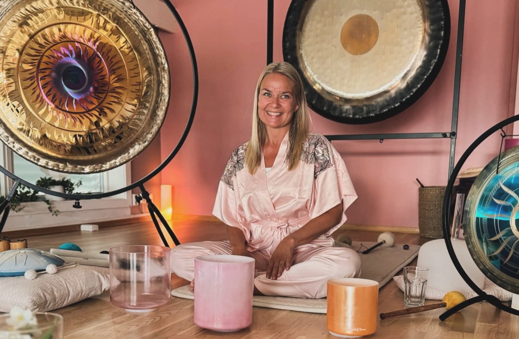 Timen ledes av Lise Bjørvik, som er yogalærer og lydhealer