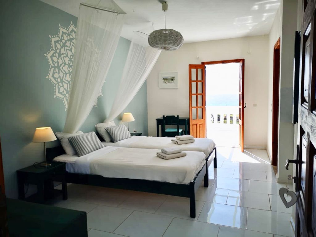 Vi bor i hyggelige dobbeltrom, med egne, enkle bad og balkong med fantastisk havutsikt.